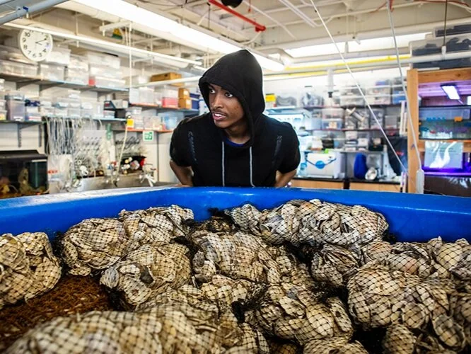 Through CTE programming, Billion Oyster Project staff members and practicing scientists act as advisors to students. The Harbor School admits students through the New York City lottery system (no previous maritime education required), so every student has an equal opportunity to attend. As sophomores, students enroll in one of seven Career and Technical Education (CTE) programs of study, leading to industry certification. The experience includes a continuum of work-based learning, and Billion Oyster Project provides a real-world context for practicing maritime skills, like growing oysters or designing reef structures.
