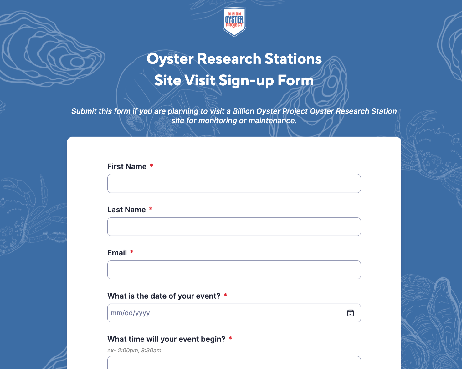 Use this form to submit data for oysters, biodiversity, and ORS cage condition